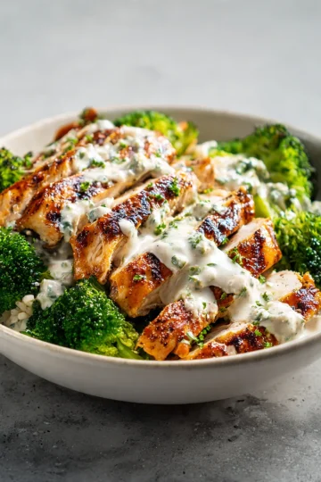 Easy Grilled Chicken & Broccoli Bowl with Creamy Garlic Sauce – Ready in 30 Minutes