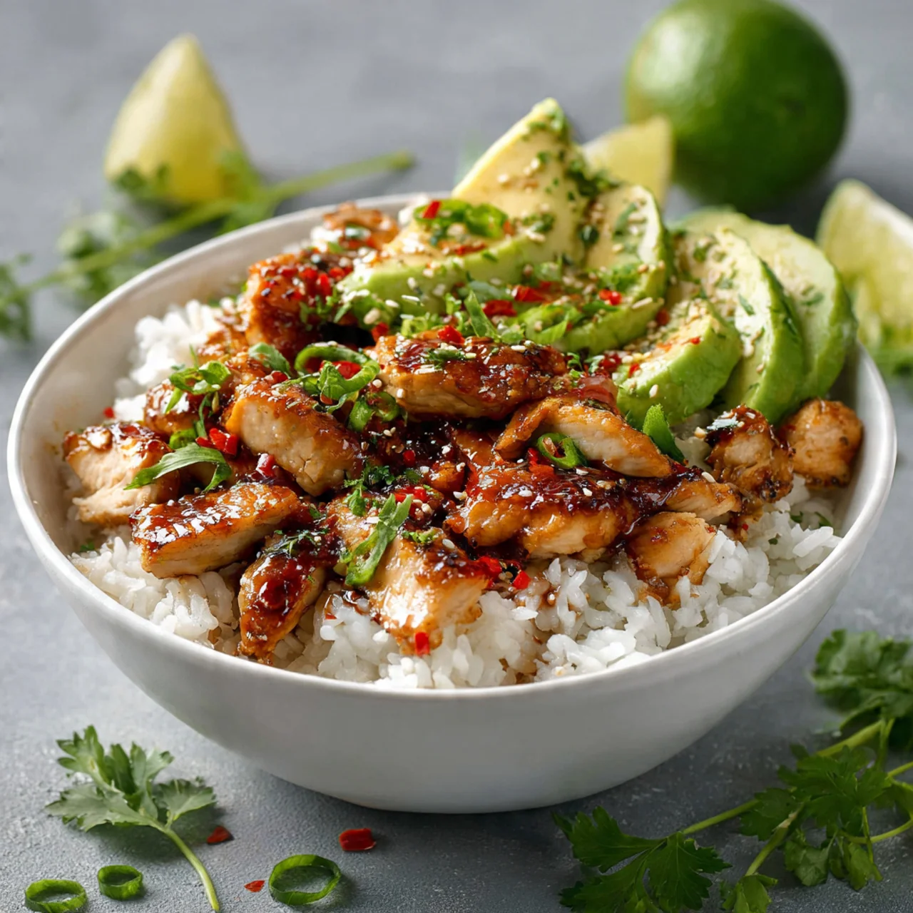 - Prepare the Bowl: Slice the cooked chicken and arrange it over a bed of cooked rice. Top with diced avocado, chopped cilantro, and thinly sliced red onion for freshness and crunch.