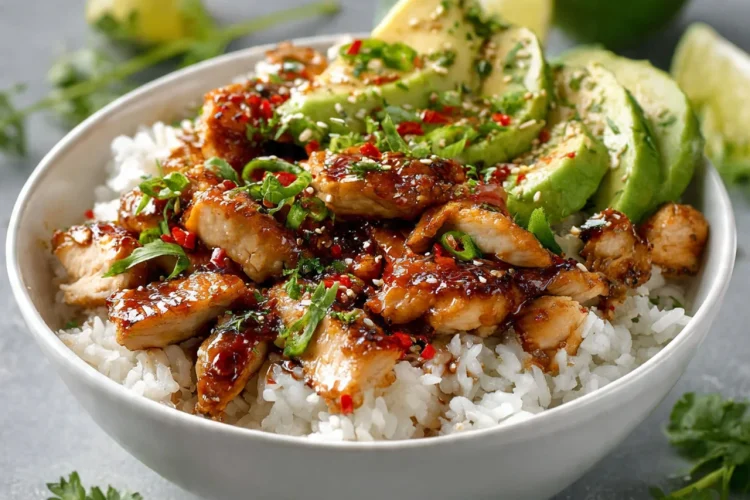 - Prepare the Bowl: Slice the cooked chicken and arrange it over a bed of cooked rice. Top with diced avocado, chopped cilantro, and thinly sliced red onion for freshness and crunch.